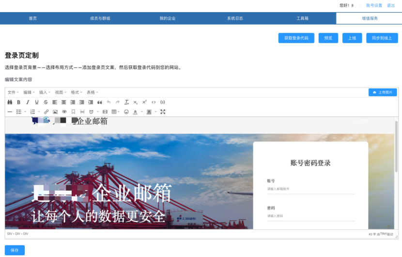 第一步,上传图片,可以是企业官网背景或者与企业运营关联的图片。第二步,上传成功之后,复制图片地址,将地址粘贴到代码中保存。点击预览,根据预览效果调整内容。第三步,点击同步到线上。